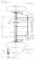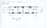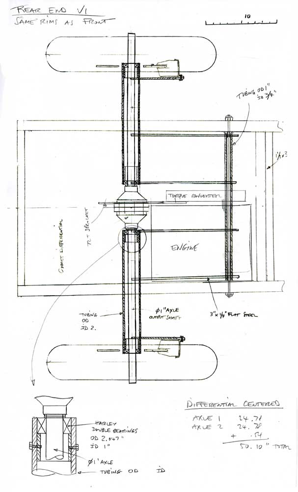 | I sketched the layout of the chassis , made of welded sections of 1.5" x 3" rectangular tubing, tapered at the front. The upper and lower wall of the tubing will be replaced with a curved 1 x 1/8" flat steel strip rolled around a 1" tubing cross tie at the very front. The same will be done at the rear end to tie the 3 pieces of rectangular tubing together. | ||||||||||||||||||