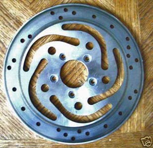 | I found a better Comet disk brake caliper to use instead of the small one in the drawings above, and revised the design as below. The reversed spindle is a lot stronger that way, the brake disk is attached to the hub, and the rims can be removed to change a tire. The center of the Harley disk could be cut out and the second row of holes used to bolt it on. | ||||||||||||||||||