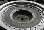 | I went ahead and cut one hub out of a front Harley wheel to prove my theory , which worked, but proved hard, and burned up my 4 1/2" grinder... I finished with the heavy duty 9". I also drilled the bore at 2" all the way through with a carbide tipped hole saw. The inside is rough from casting, and will have to be planed perfectly parrallel to the outside of the remaining hub. | ||||||||||||||||||